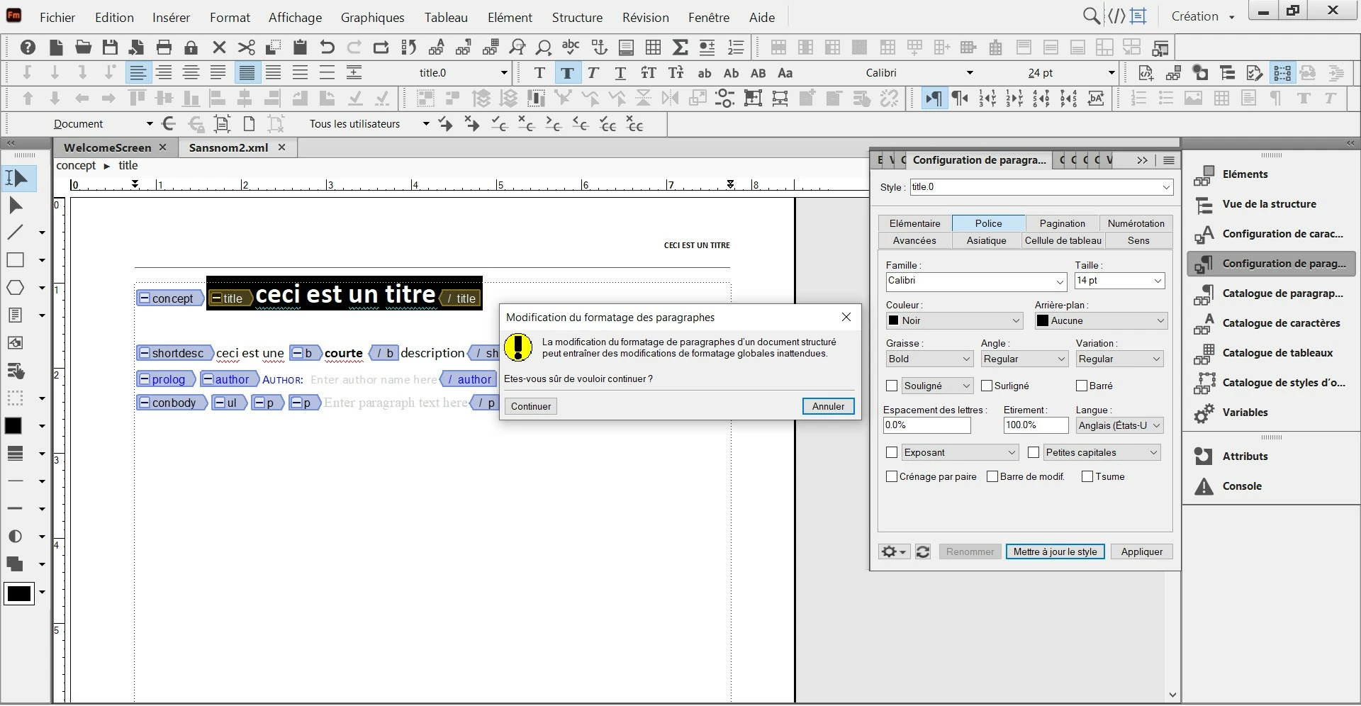 I have tried to do a FM structure, and would like to modify the selected "Title". So I have opened the "paragraph designer" to change the font size, but I have an alert message saying me that if I do that it "can lead to unexpected global changes ".