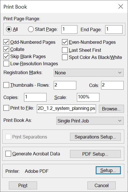 When you want to print a FrameMaker file or book to a physical printer on both sides, you have to change the printer settings. In this dialog click "Setup".