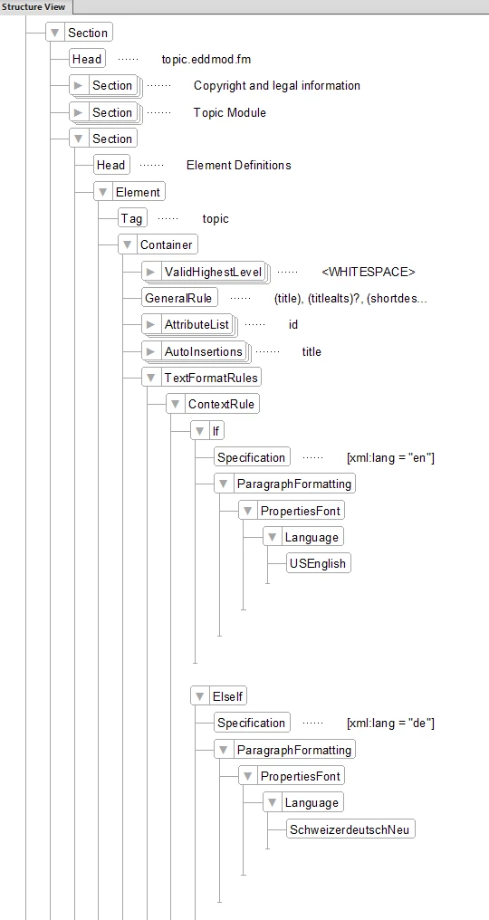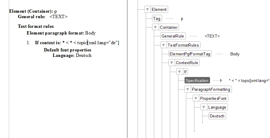 I am using structured FM 2020. To create my content, I use xml format and DITA. In the xml files, I can set the xml:lang attribute to the language of that topic, e.g: <topic id="bla bla" xml:lang="de"/>, where I set the language to German. Now when I open the xml file in FM, the Language under the Font tab in the Paragraph Designer remains English, ignoring the xml:lang attribute. It means I have to manually change the Language to German.