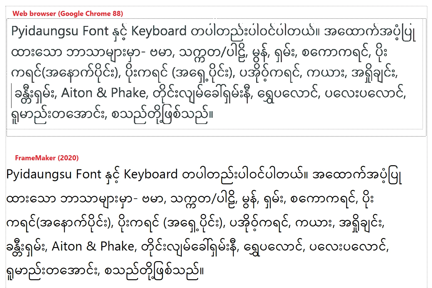 Hi, I have FM file language burmese and my consumer would like to use the font Pyidaungsu Unicode but after change font it look like FrameMaker cannot support font type burmese unicode.