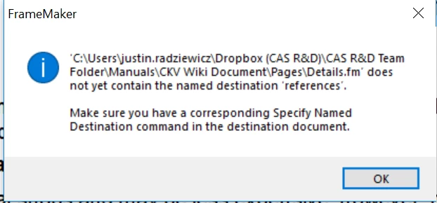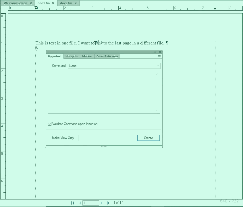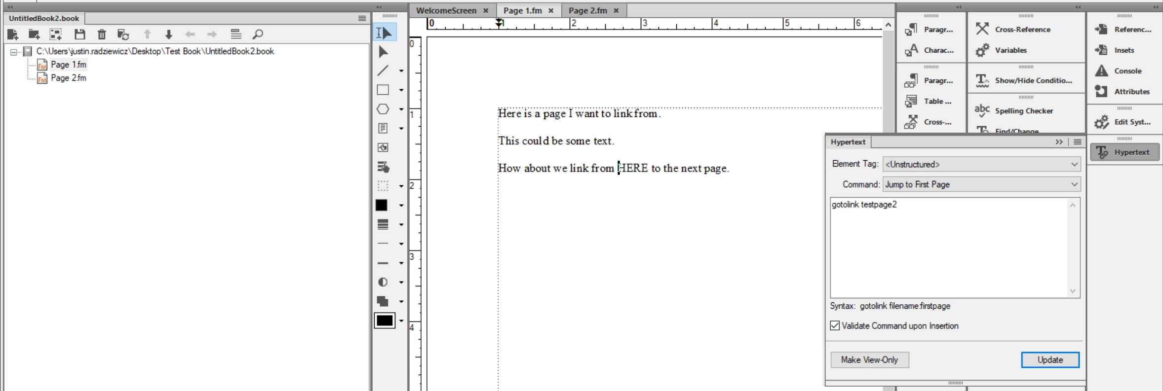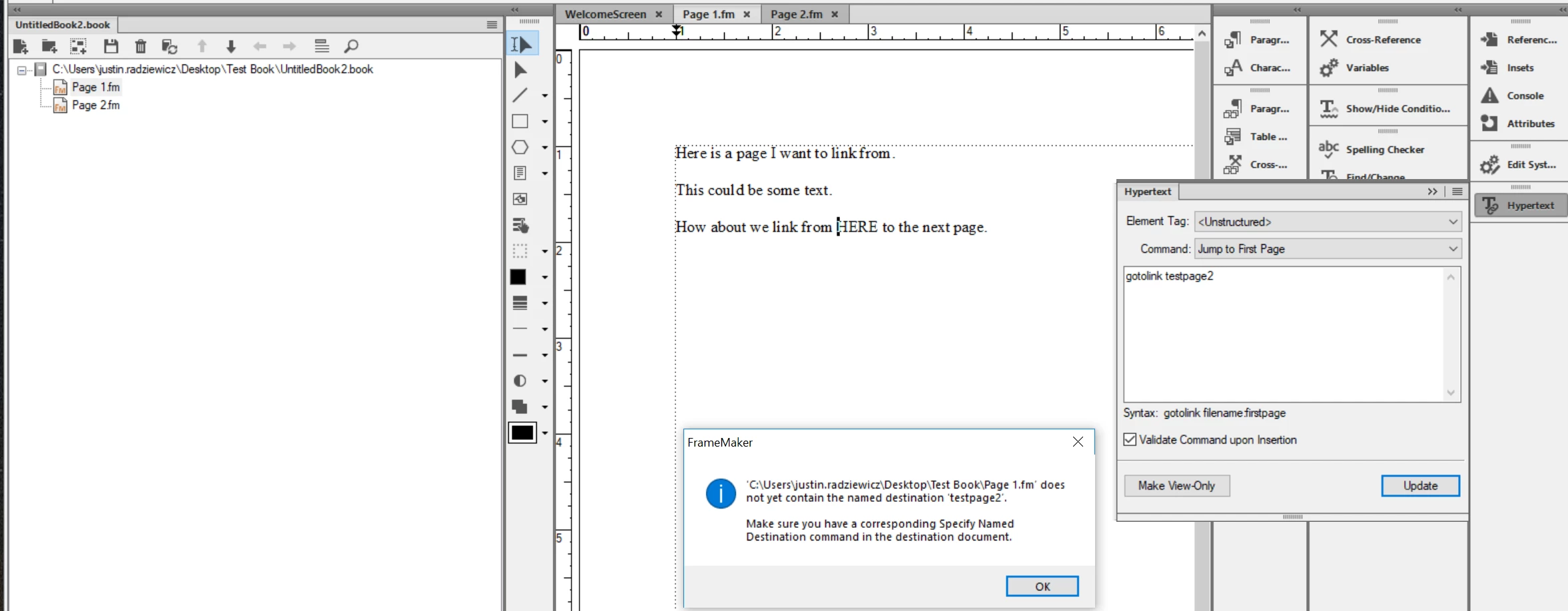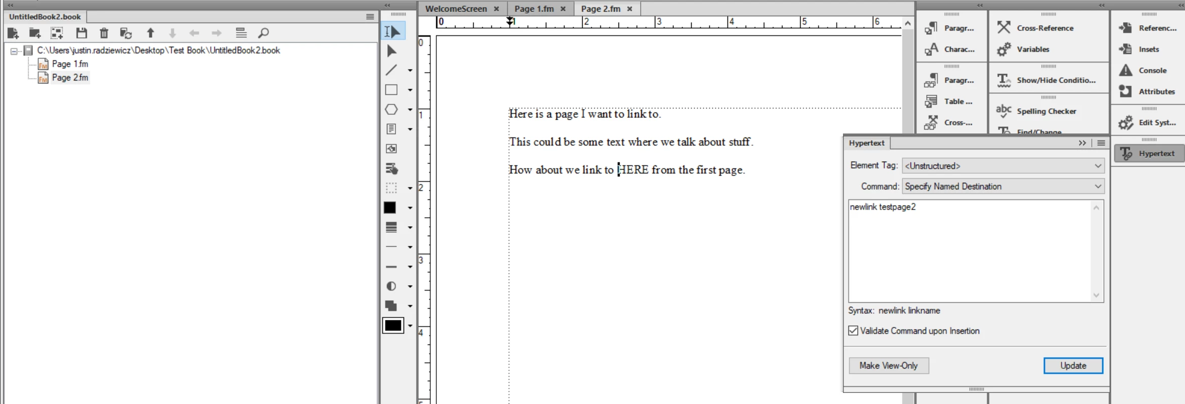 I have been messing around with this and searching for an answer for some time now. I have a book made up of various pages. I have a page called "Details." I would like to link a few words on this page to another page located in the book called "Appendix." I have tried Hypertext and cross-reference methods and cannot get them to work. I can hypertext within the same page. For example; if I have the "Details" page open, I can link a word from page 9 to a page 11 heading. My issue is, I cannot get words from page 9 to page 20 to link.