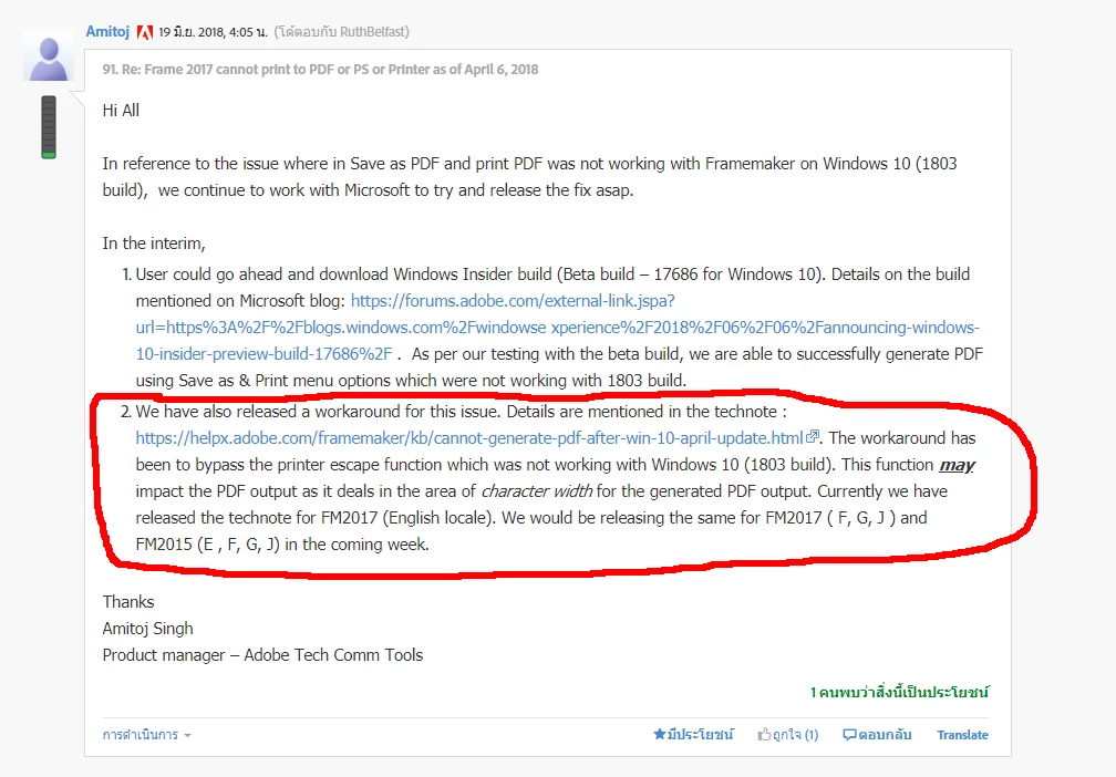FrameMaker cannot generate PDF after Windows 10 April update (1803)