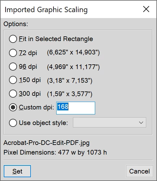 I'm using FrameMaker 2017 all patched up (14.0.3). I import an png image (a screen shot at 96 dpi) and I select 150 dpi in the "Imported Graphic Scaling" dialog. However, this doesn't seem to work: the image is scaled to 1.04% of its original size and the dpi is "unknown" in the Object Properties dialog panel pod thing even though I didn't scale the image by dragging one of its corners.