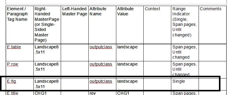 The <fig> element has an output class that tells FrameMaker the landscape master page should be applied to it. This output class is referenced in reference page.