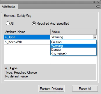 The SafetyMsg element currently has an Attribute Name titled "a_Type", containing 3 values: Danger, Warning, and Caution. See pic: