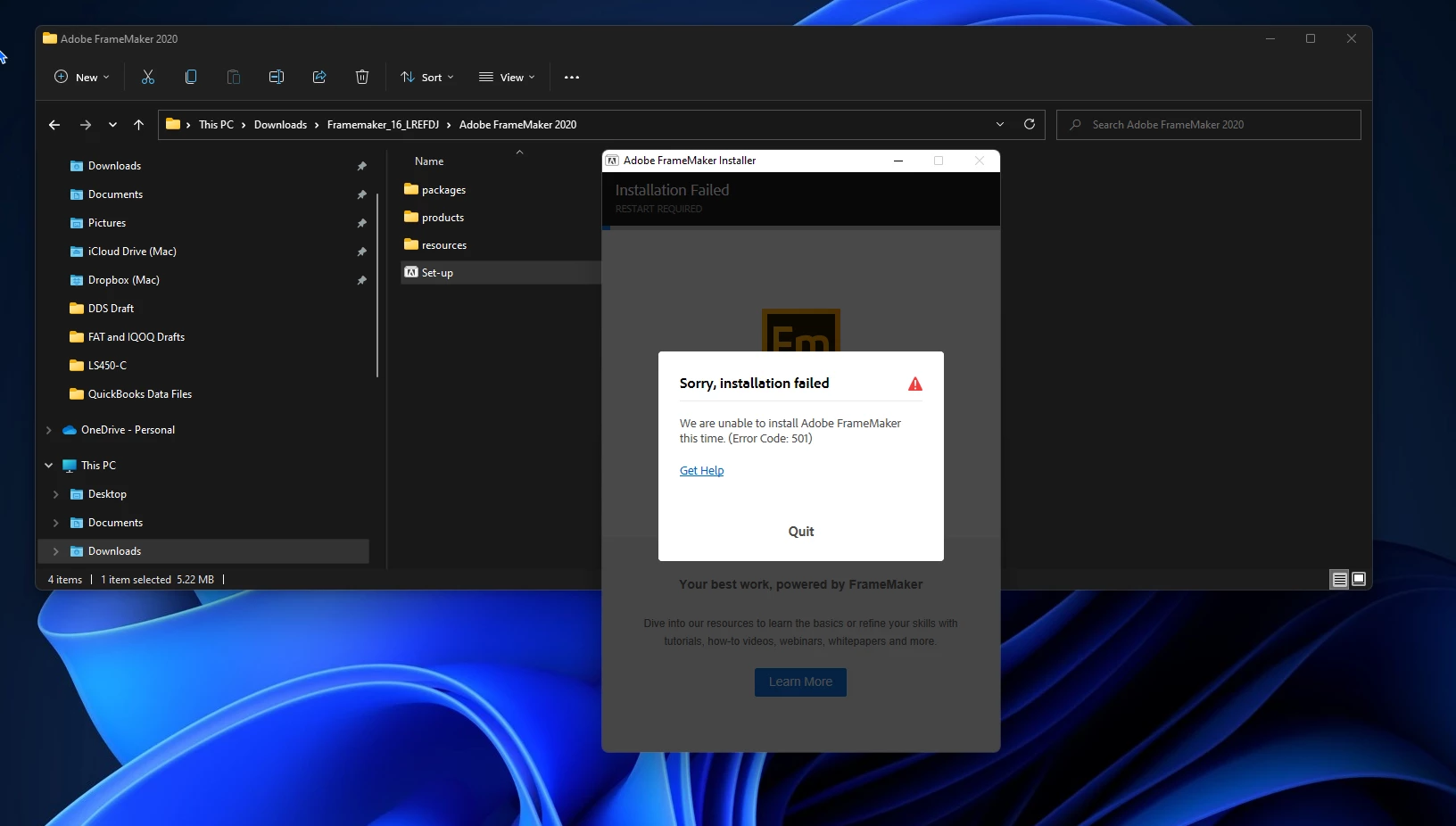 I am attempting to install FrameMaker 2020 on Windows 11, in a Mac Parallels 18 Pro vm environment. I get an error 501 - unable to install due to unavailable resource, with no reference to an unavailable resource. What can I do?