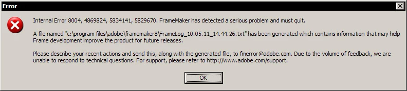 Just wondering if anyone else gets this error as frequently as I do. This occurs at least two or three times a day for me while I am resizing an anchored frame or using a line tool or the polygon tool to create a callout arrow. Gets frustrating after a while. I am using FM 8p277 with XP Professional SP3 Intel Xeon 3.0 GHz with 4 GB of RAM.