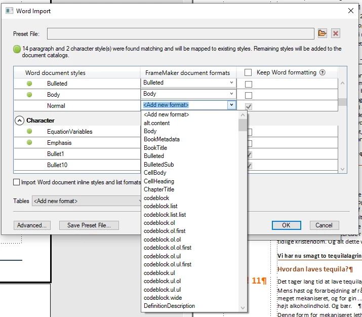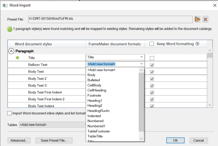 The Preset window appears to have only a limited set of FrameMaker styles to choose from when attempting to map the sytles contained in the imported Word document.