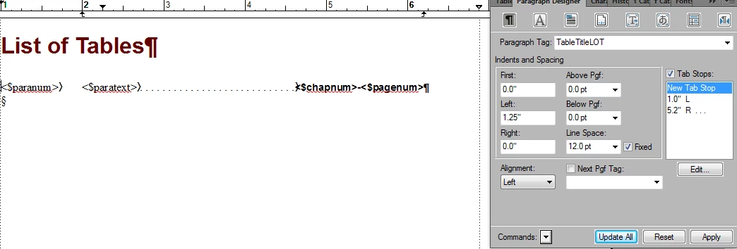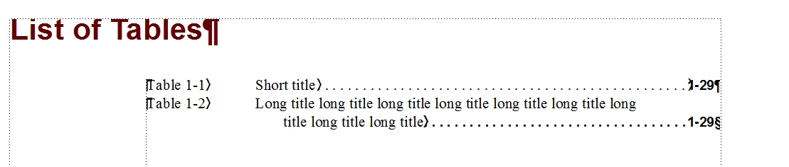 Hi, I am using the TableTitleLOT paragraph tag to correctly align page numbers with leader dots for any tables titles that are longer than one line.
