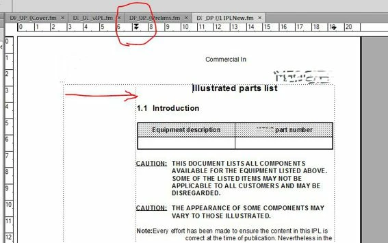 If anyone has any ideas on this problem it would be gratefully received. Occasionally, I am working on a document and a new "unexplained" indent appears on the left of the page which pushes all the paragraph tabs to the right. There is no rhyme or reason as to when this happens or why it appears, but when it is there, I cannot get rid of it. The paragraph markers (circled below) cannot be dragged to the left and there is no indication in master pages or any of the paragraphs tabs what the cause is. It is very annoying, the only way I can get back to normal is creating a new document and starting again. The grab below shows how far the indent is in when it appears. This particular occurrence wass in FrameMaker 11 but I think it has happened before in earlier versions, however it is not a regular occurrence (4 /5 times in 5 years of using FrameMaker).