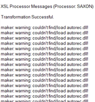 This week I have been inducting a colleague into the FrameMaker world so that they can take over some of the responsibilities for the application. We've installed the identical version of FM, correctly specified the Saxon path for their environment, and gone through loading, editing and saving a number of our documents. So far as we can tell the inputs and outputs are identical, but when their FM runs the import or export XSL transform, their FM console echoes the following line hundreds or thousands of times: