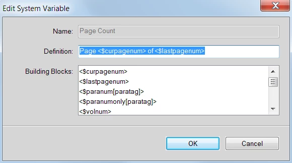 FM, unstructured, 2019. Created a table on body page that has a header row that includes a block that needs to show the current page # & the total page # in a cell. Is there any way to add a variable on the text page that will show the current page number in the cell when additional pages are added to the file? Also the page numbers in that block do not relate to the page numbering that shows in the footer of the document set up on the master page.
