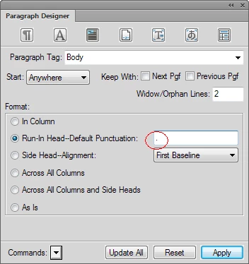 I am working on FrameMaker 11. How do I format my run-in heading to end in a period but not have the period show up when I use that heading in a cross-reference? Or can that even be done?