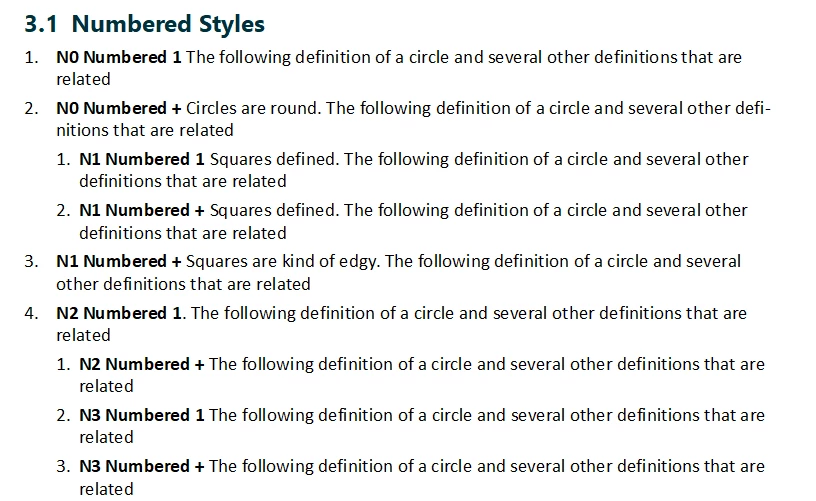- Subnumbered1 (for the first in a list - 2nd level in a hierarchy)