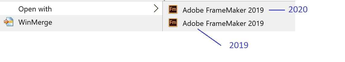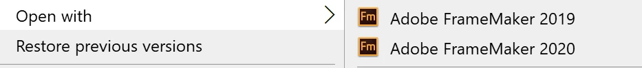 On one Windows 10 computer, which just happens to be my Visual Studio development system, I have both FrameMaker 2019 and 2020 installed. When I right mouse click in File Explorer and choose Open with, the two FrameMaker options are identical, as shown below.