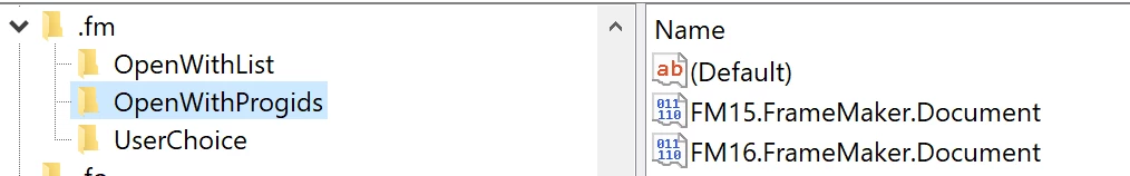 The FM16.FrameMaker.Document classid points to 2020 as expected, and is proven by clicking on the top entry from Open with.
