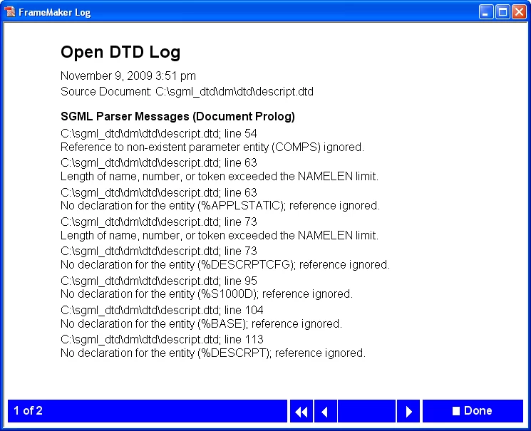 my situation is this: I have a DTD which I've used before (S1000D v2.2 Descriptive DTD); I have Frame v7.0p579; I'm on WinXP. All I want to do is create my EDD so I can create my template and then my structured app. But when in FM I start the process (File/Structure Tools/Open DTD ...) and select my DTD I get the error msgs as shown on the attached file. At the moment I'm at a loss to know why this is happening. I've done it before, albeit on another machine, but I don't recall ever getting so many problems. The DTD is an issued one so I have no doubts about it but for some reason it just will not get translated.