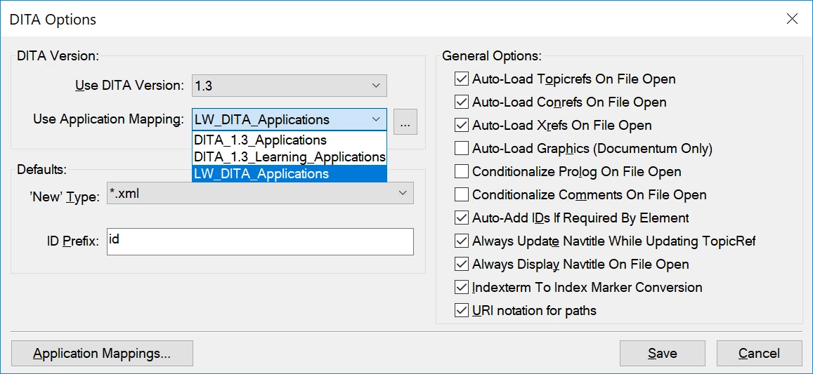 To start using the LwDITA application, switch to the LW_DITA_Applications in the DITA Options settings: