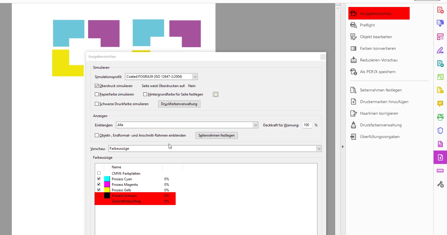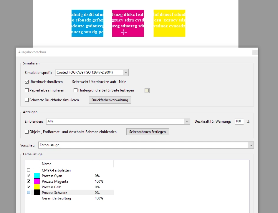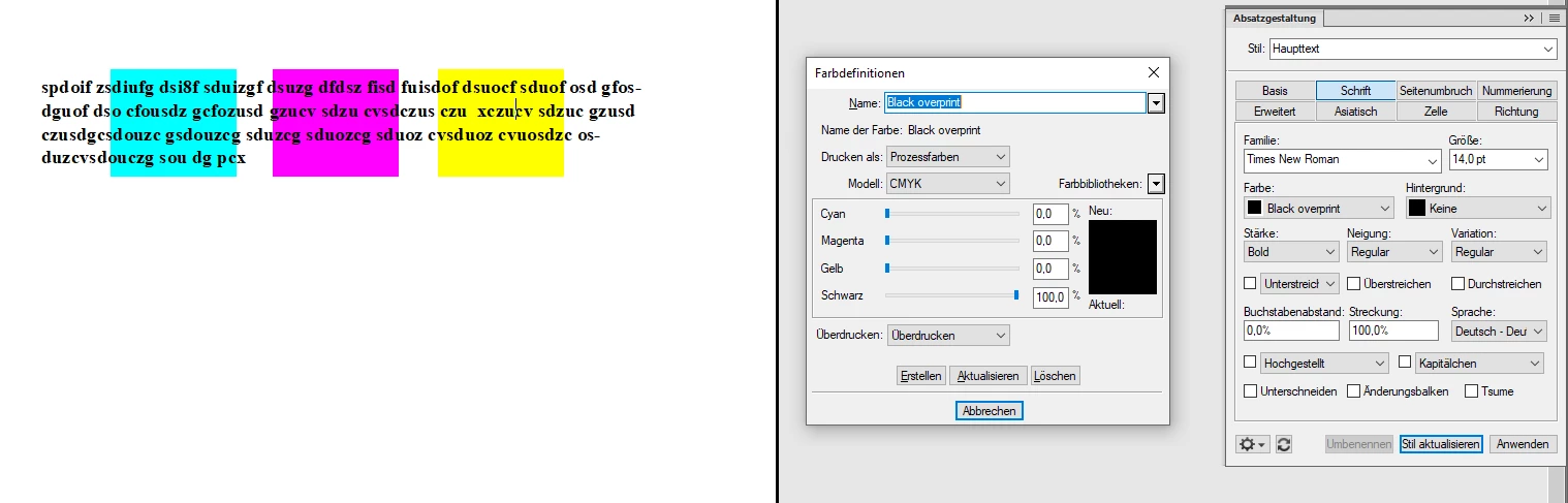 I use warnings in which black text runs over colored backrounds. I've tried everything, but couldn't manage, that the text is not knocked out. What me also wonders: When creating a new, blank document, the standard black color is set to knockout ("Aussparen" in the German version). This is fundamentally wrong - you would never set black to knockout. This color is mainly used for text - and you would never want text to be knocked out (except in some rare cases where you want a maximum deep black).
