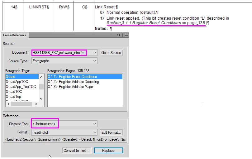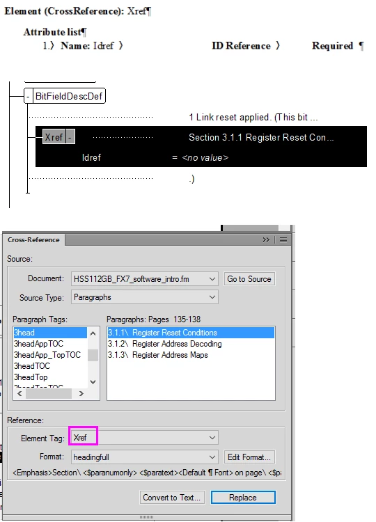 I structure the document using a conversion file and EDD I imported into the template and the cross reference appears successfully in the GUI (but there's no ID attribute, Idref = <no value>).
