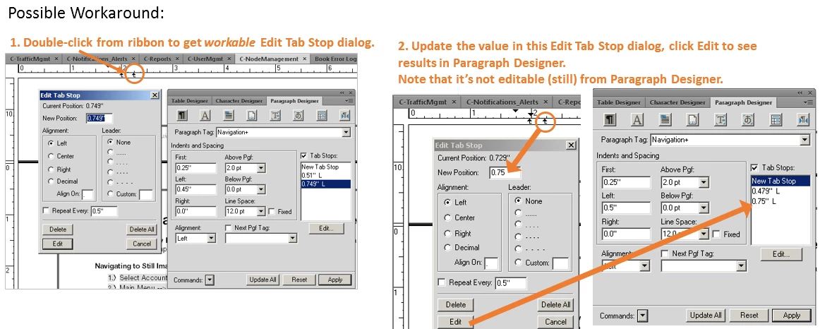I sometimes can't add a new tab stop, or edit a tab stop that has already been added, using the Paragraph Designer. Here's what happens: