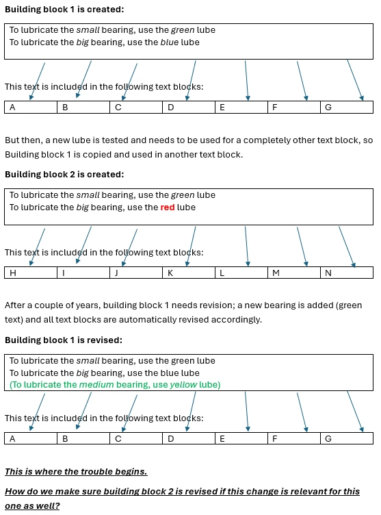 After a couple of years, building block 1 needs revision; a new bearing is added (green text) and all text blocks are automatically revised accordingly.