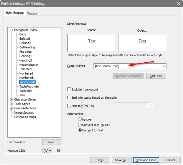 If I change the settings to not map the SourceCode para format to PRE, and instead use "Use Source Style"