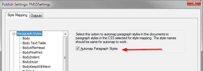 Tip: You don't have to tediously pick each output style for each source style in the Style Mapping dialog. Instead, select the "Paragraph Styles" item in the list. Then check the box that says "Automap Paragraph Styles". This does the automap for all the styles, and even informs you which styles have already been manually mapped previously.
