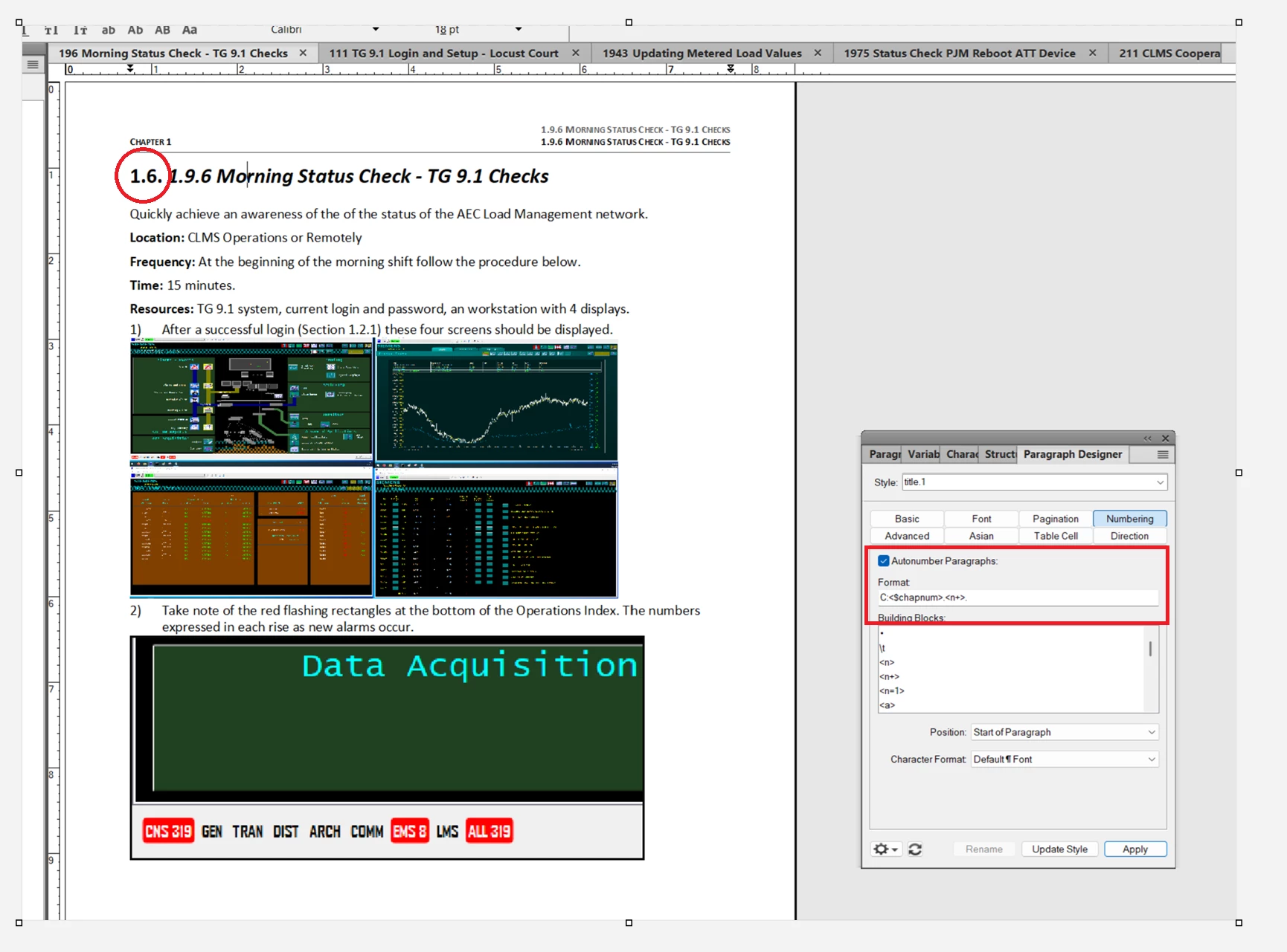 I am working in structured FrameMaker. I have created a ditabook. In the ditabook the concept titles include chapter numbering. After saving the ditabook as "2022 Book with FrameMaker Components" I attempted unsuccessfully to add auto chapter numbering. As shown below the unsuccessful attempt at numbering added numbers I don't need at the start of each chapter. I know the chapter numbering is configured in paragraph designer, and I can remove it chapter by chapter, but how do I remove the auto chapter numbering for the entire document?