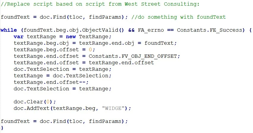Thanks to our Frame experts, I've developed a script that finds all occurances of a word or string in a document. When found, I want to replace the word and display it as a Track Text Edit. I'm running into two problems. 1) After enabling Track Text Edits and running the script, all change appear as normal text; not Track Text Edits. 2) The beginning offset of the text range is correct, but the doc.Clear and doc.AddText leaves the last character of the found text after the replacement text is added; e.g., foundText = "widge"; replacement = "WIDGE"; result = "WIDGEe".