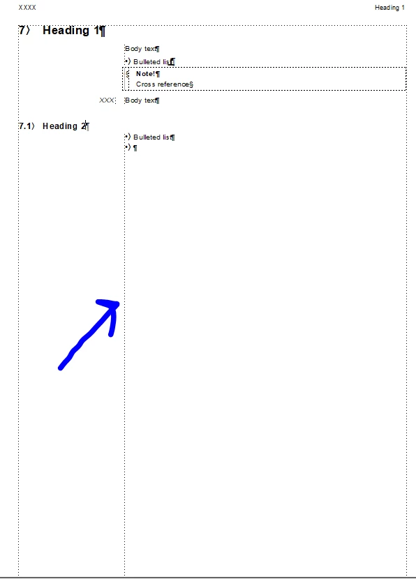 I'm quite new to FrameMaker and I have a questions regarding resizing a text frame. I know how to resize waht I believe are the margins by using ctrl + click the dotted lines of the whole page. But how do I resize a text frame within the whole page? See the blue arrow below. I would like to know how to resize the text frame were the blue arrow points at to be able to adjust it more to the left or right.