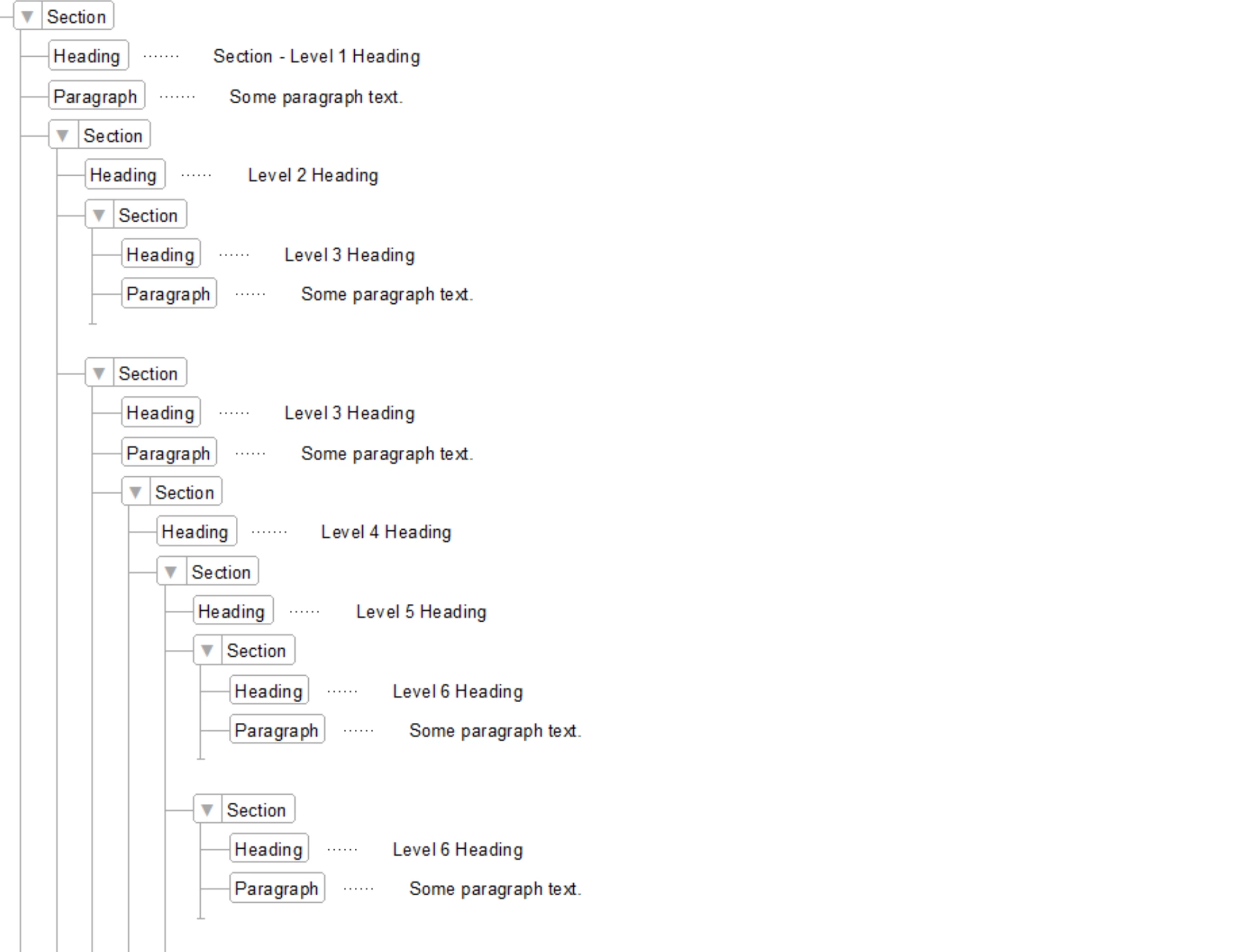 1. Instead of using a Headings element for subsections and their further divisions, reuse Section.