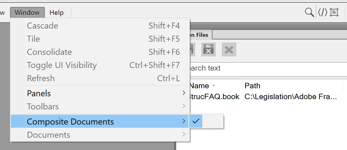 This is a FYI, in case you come across this particular bug. A customer's user was opening books in FrameMaker but the book pod/panel was not shown. The book was shown in the Open Files pod/panel, however the Window->Composite Documents was enabled but no nothing was visible, as shown below.