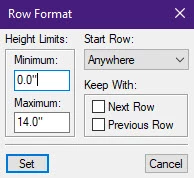 The row height appears to be locked. I tried to increase the maximum height at Table > Format > Row Format, but I can't increase the maximum over 14.