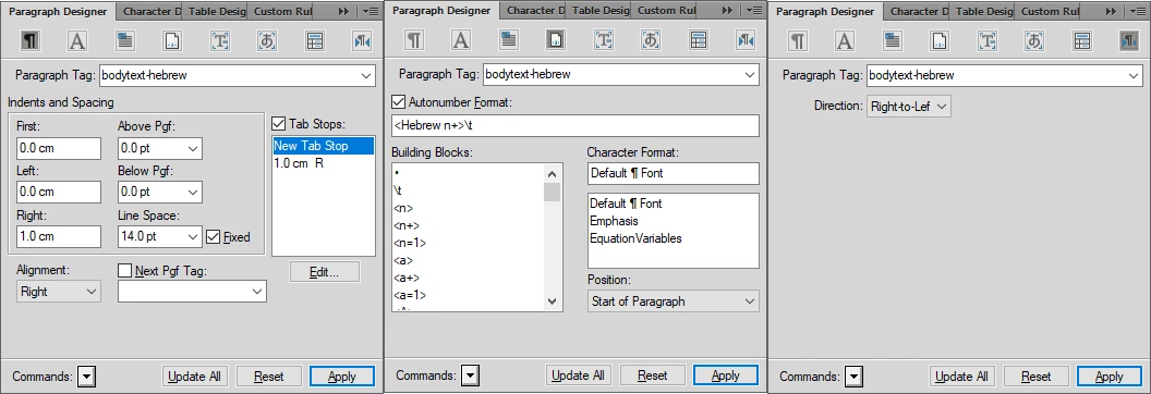 I have a paragraph containing the Hebrew text wihich reads from right to left and want to have it adjusted correctly (on the right marginI. The I wanted it to have an indent of 1cm for automatic numbering.