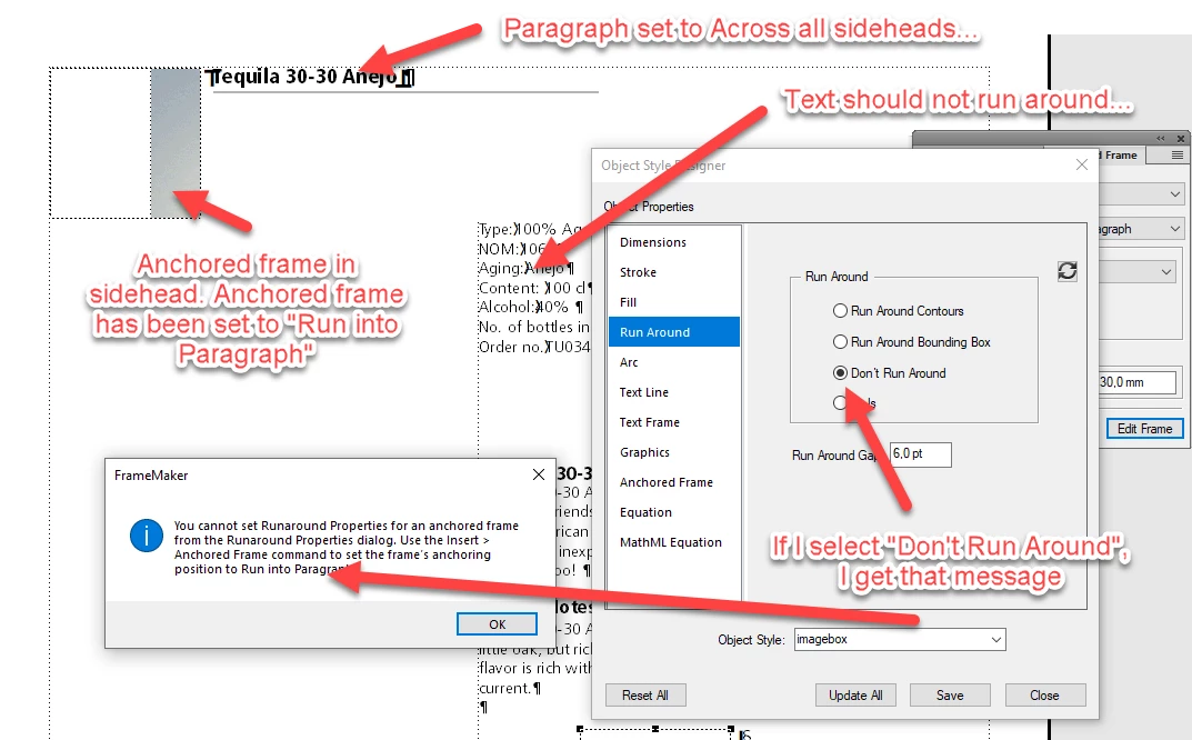 - Now I would like to set the anchored frames Run Around Properties to "Don't Run Around". But I get a non sensical error message (Shown above). I want the body text to flow up under the headline. But I can not make that work. But why not, actually?...