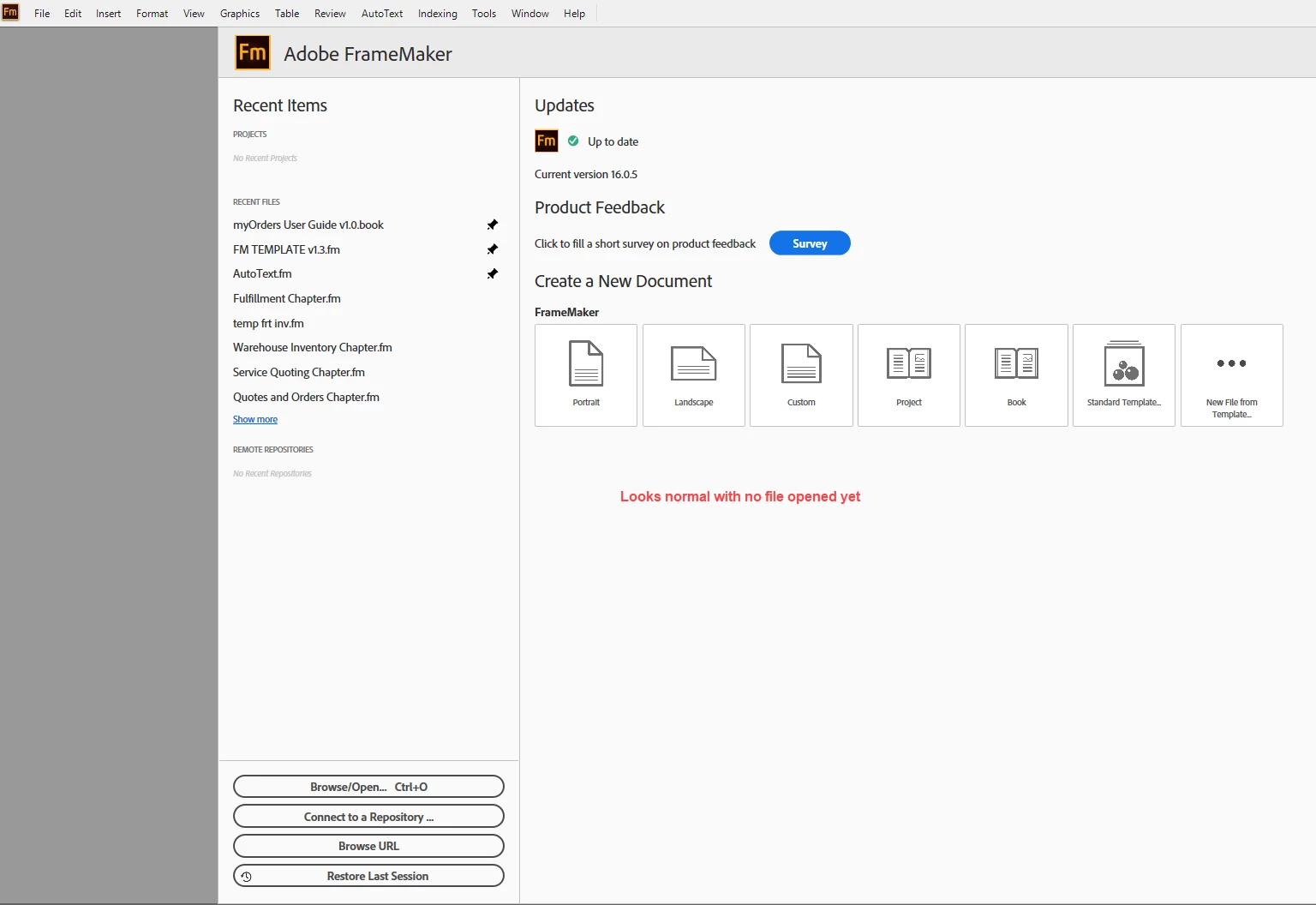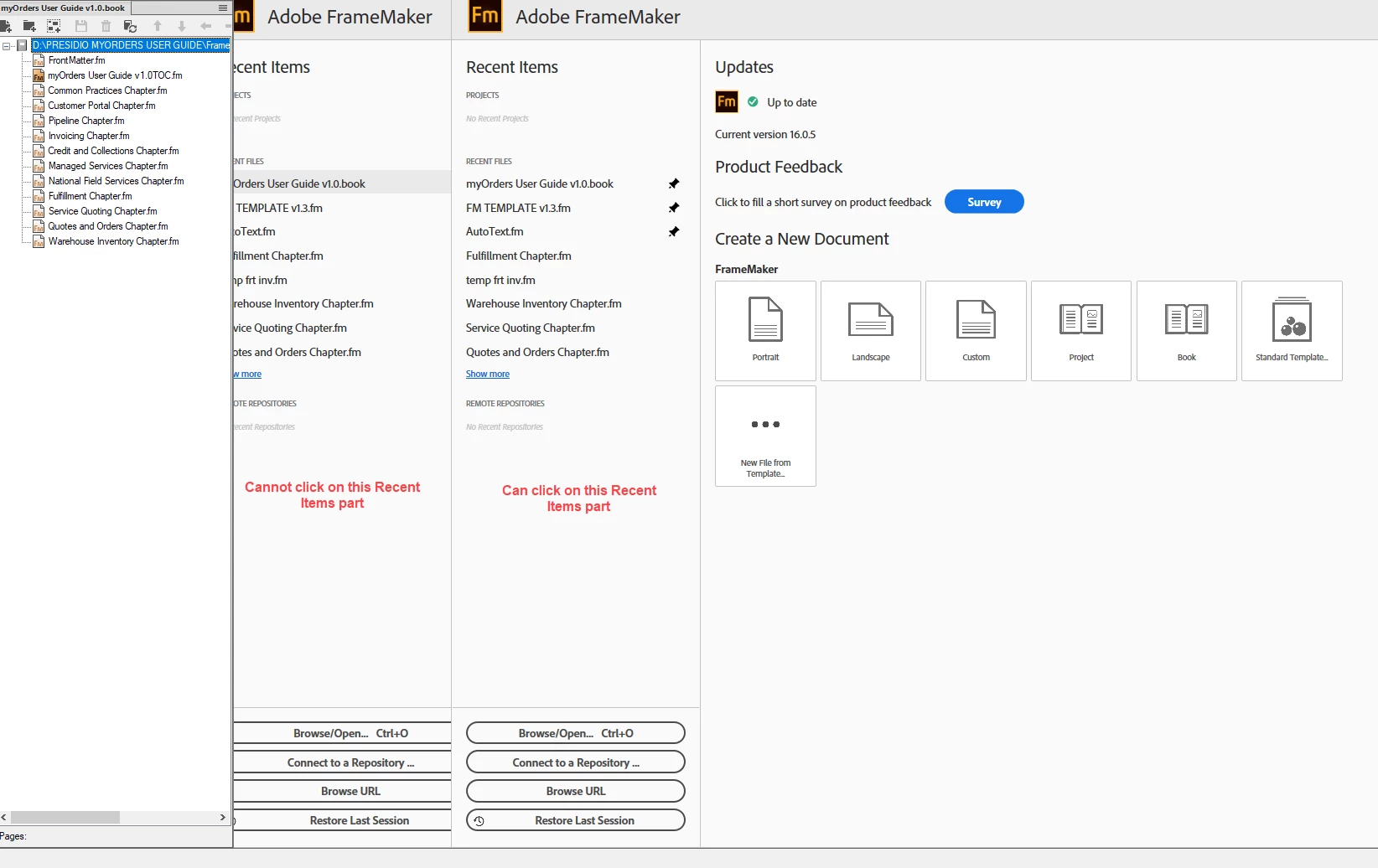 I open FM and it looks fine. I open a .fm file and it looks fine. But if I open a Book file I see TWO Recent Files screen. The one on the left is frozen and I cannot click on any link. The one on the right is normal.