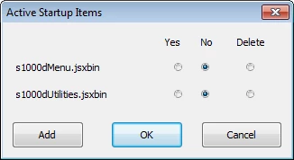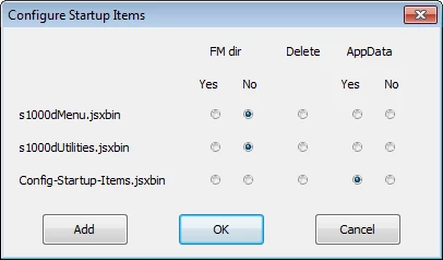 I have now created a script to ease the installation and configuration of startup items (scripts in the startup directory of FrameMaker). The script works for all FrameMaker versions that include ExtendScript. It shows a list of available items with a set of radiobuttons to decide what to do with each item. You can add another item (bringing up a dialog to open the file) and move the existing items into an "inactive" subdirectory (making them disappear without being deleted) or delete them.