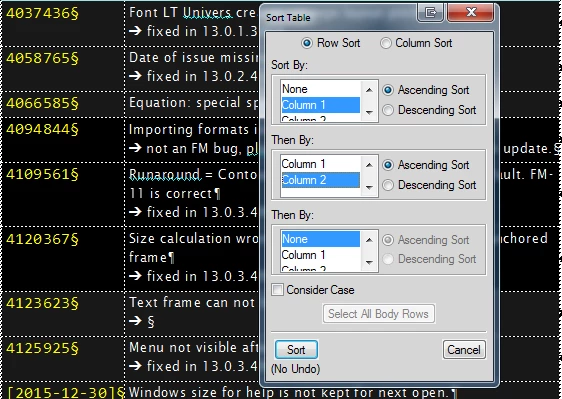 I am not able to find any frame maker function to sort the table in ascending order with respect to column 1. Please, guide me how I can write the extended script in frame maker to sort the table.