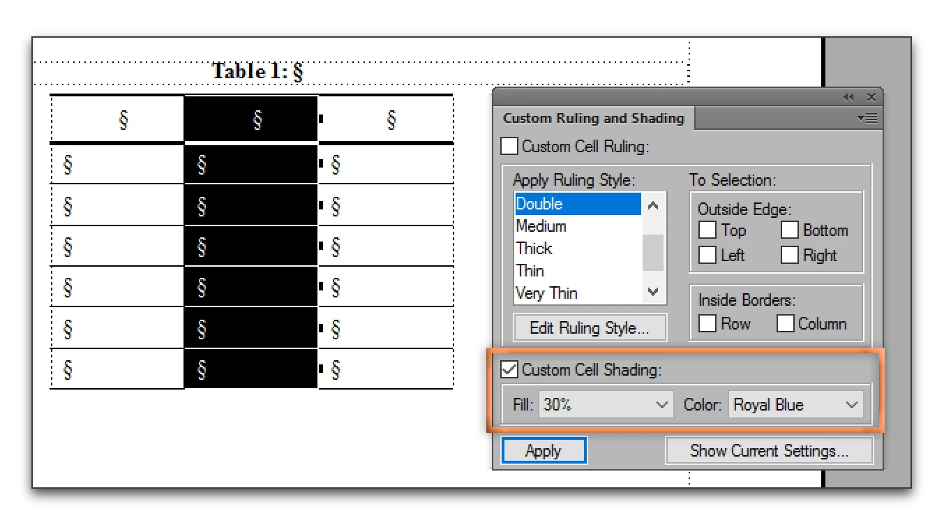 I am having trouble shading a single column within a three (3) column table. I'd like to shade the middle column to provide a visual separator between the columns with entries. Can someone please advise on this seemingly simple task?