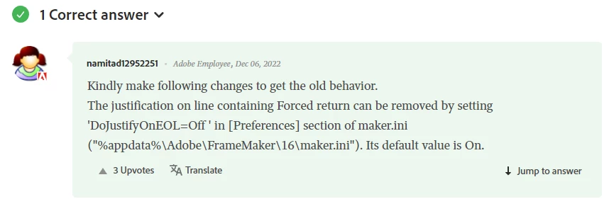 This was all fine and dandy until I upgraded from FM 2020 (16) to FM22 (17). Now all the words in the last line of a fully justified paragraph followed by a soft return are spaced across the entire width (see below).