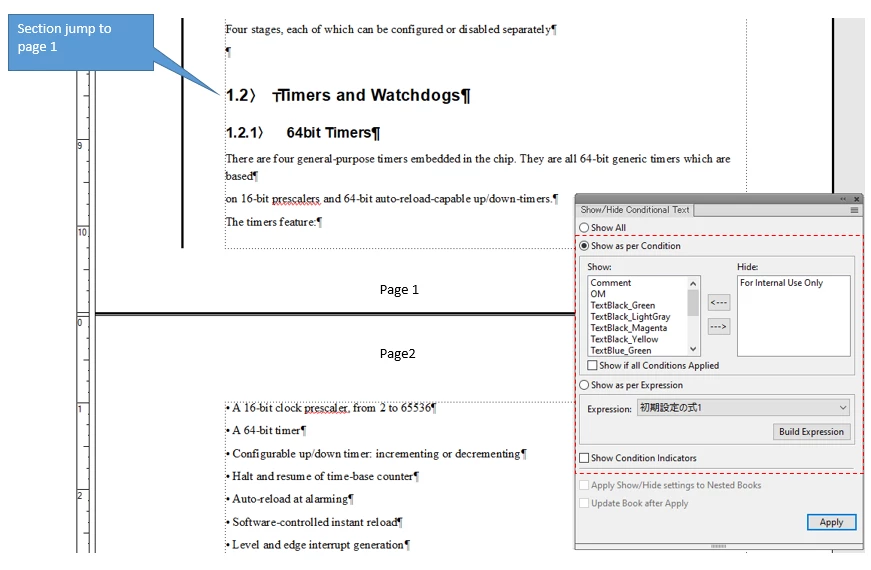 However, when hide conditional tag, the content is hidden along with the position of the page break mark being lost. So, section [1.2 Timers and Watchdogs] jump to page 1.