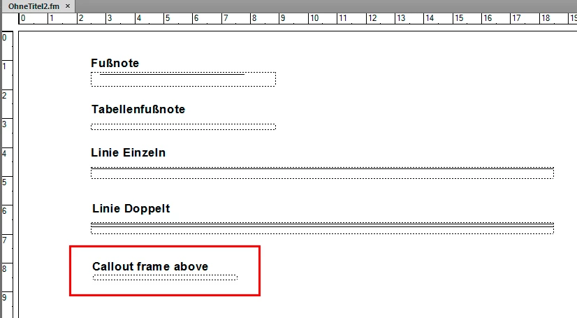 1. On the Reference page, create a new empty graphic frame with a useful name (I've named it "Callout frame above" in the example shown below). Note: The name is given when creating the frame and cannot be modified afterwards! The title above is just text which does not control the frame's name. Make sure the frame is transparent and does not contain any color fill: