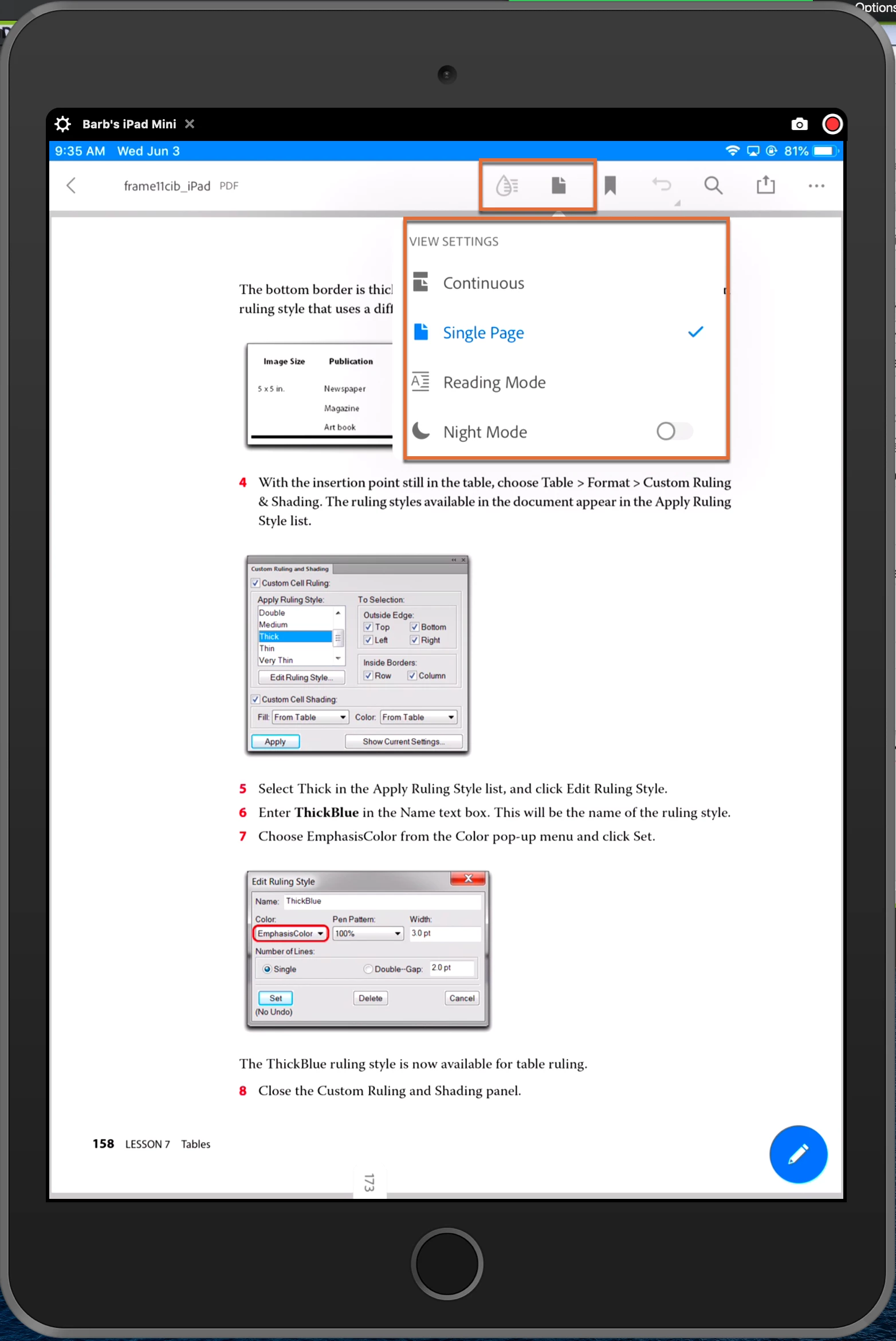 What size text frame would be used for a document to be viewed in a PDF on an iPad?