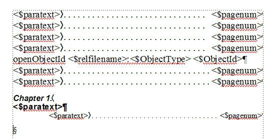 There is an object in the TOC Reference Pages that is not text and I can't select it so I'm wondering what it is and how it got there. I need it to build my other TOC files so that I have a return after the Chapter Title when the Table of Contents is built for the user manual.