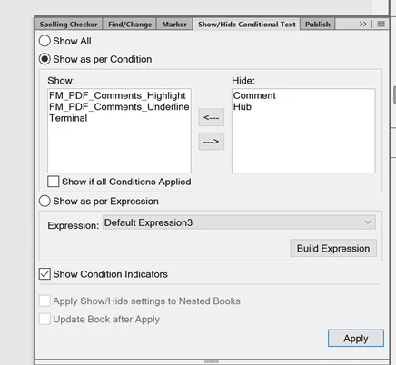 August 2022, Inherited an Adobe FM book architected in 2019 by a tech writer who is no longer with the organization. Now trying to use the 2019 source .bk file to produce two versions of the book three years later. I performed a Save-As and changed Master pages to reflect 2022 dates. Two versions of the Conditional text are already in place; one for the hub and one for the terminal. We have copies of the 2019 pdf files of each output so it's possible to print them in the two distinct Conditional formats. When using the Conditional text window to toggle the displayed .bk image to the other version, I click Apply. It prompts No Undo. Am I in the incorrect window? How does the author output the other Conditional version without wiping out first version? A pointer to Conditional help tutorial would be helpful, perhaps?
