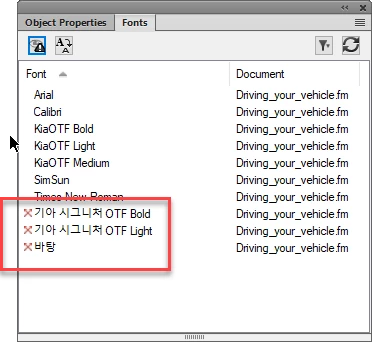 I have some korean FM documents which have been made using a corporate font. I have the proper font installed and can use it and FM recognizes it.
