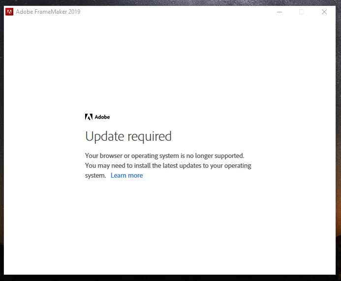 1. I cannot find a vaslid installer for Adobe FrameMaker 2019. I looked over Adobe Help webpage and I downloaded GM X64. When I tried to install it returned an error: Please update your OS or browser. WOW. Two days ago I worked on the same computer with the same settings and OS and FrameMaker 2019 worked fine. Now, it does not recognize the OS.