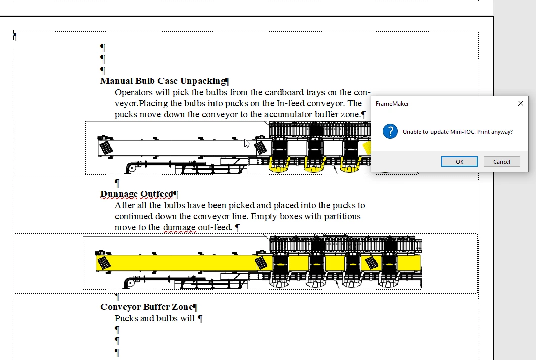 when i go to print my document to check for picture page placement, its bringing up this dialog asking about mini TOC. I do not want this document associated with a mini table of contents and i am not sure why this is appearing. When i go to search inquiry on the top of framemaker. i dont know a mini TOC to delete. is this document tied to a book somehow. i am new to framemaker and having alot of issues. thank you