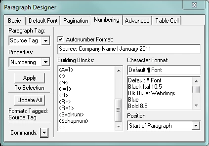 Here is the table with the "Source Tag" in the right cell, and the Paragraph Designer showing the autonumber format.